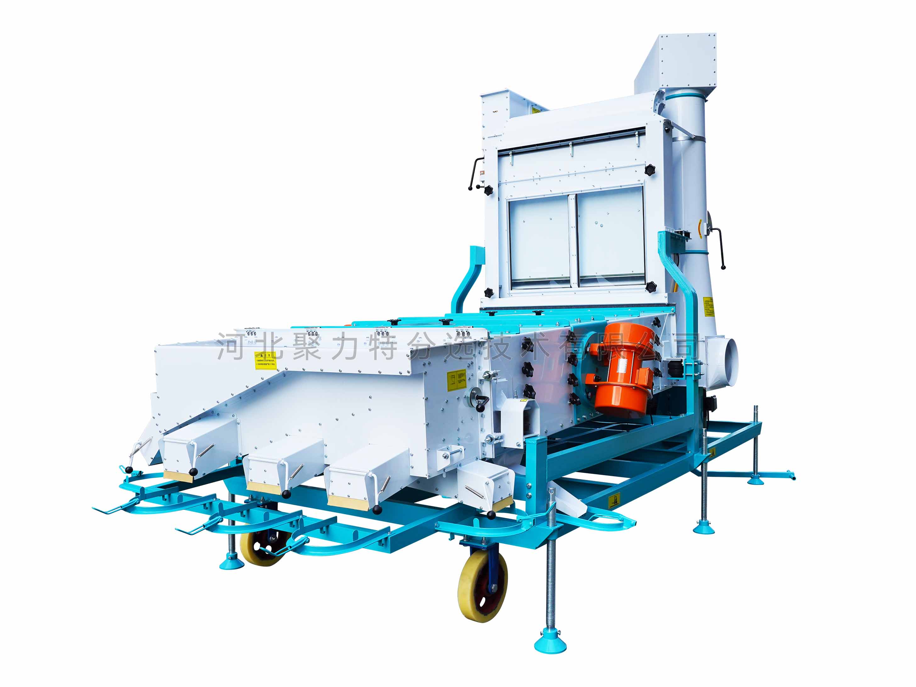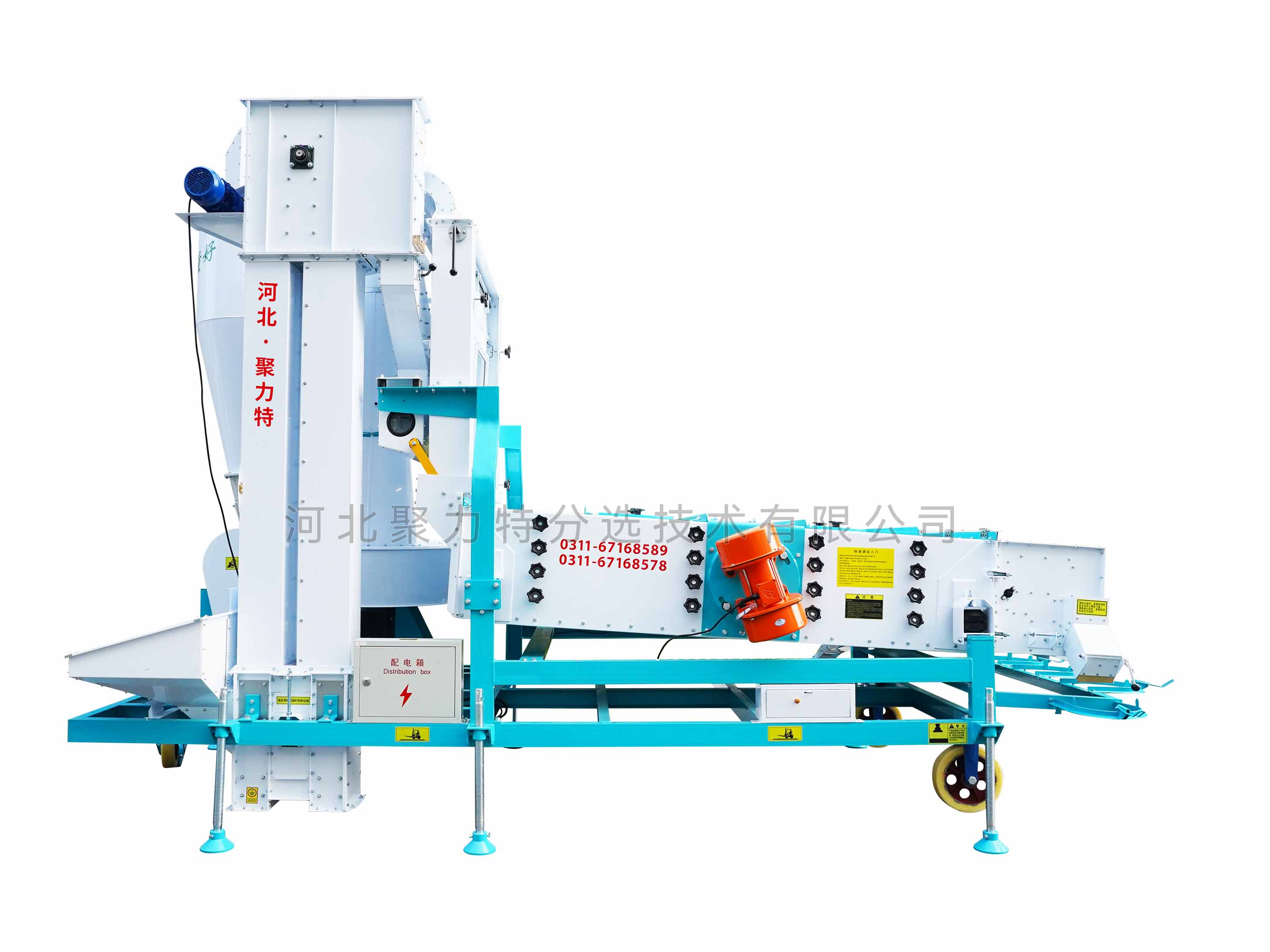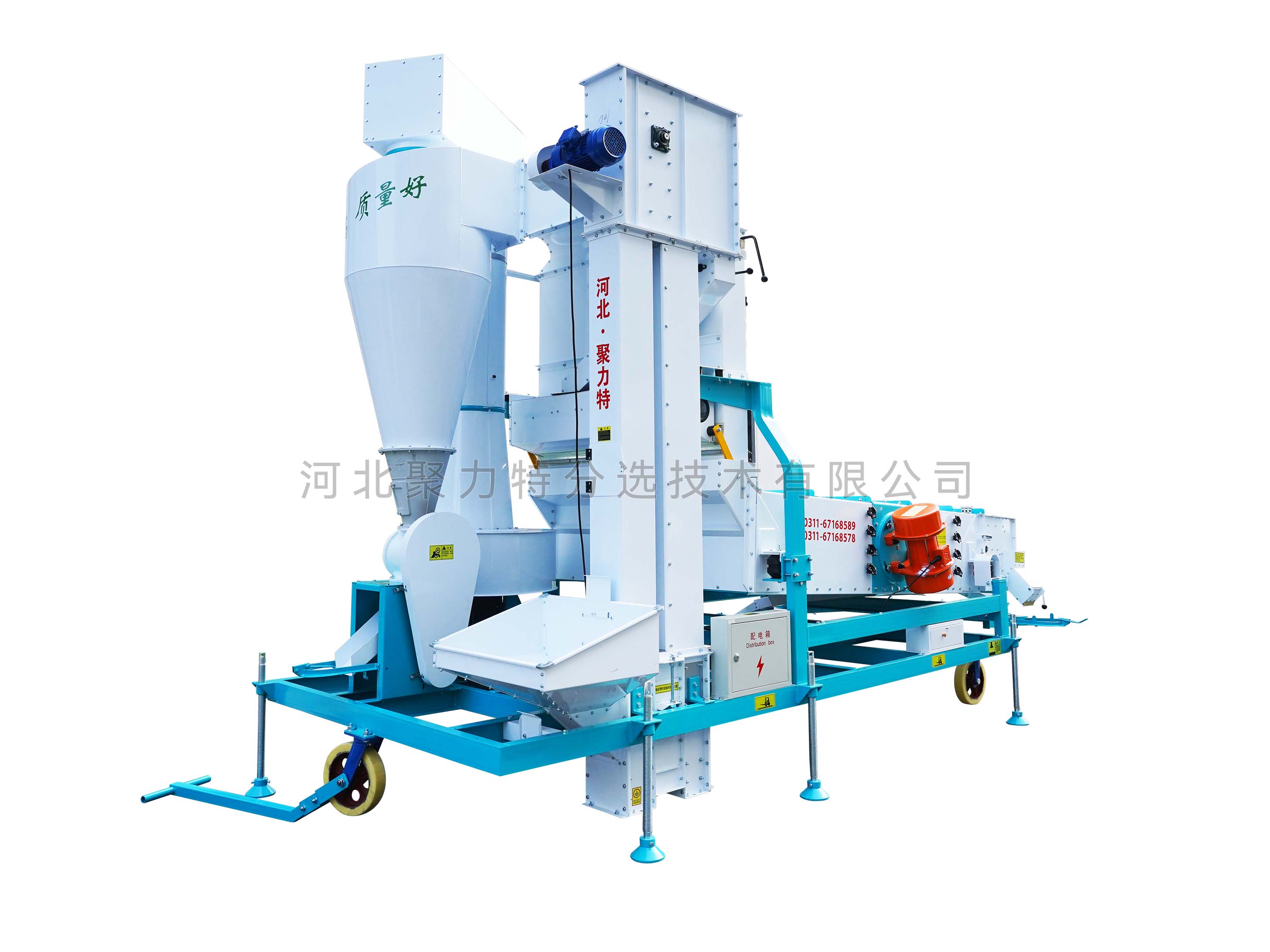 5XFS系列風篩清選機由超低速無破碎提升機、環(huán)保除塵器、密閉回轉(zhuǎn)卸灰閥、立式空氣篩、振動分級篩五部分組成。物料經(jīng)提升機進入散糧箱,被均勻分散進入立式風篩,物料在風力的作用下分離出輕雜質(zhì),輕雜質(zhì)經(jīng)旋風除塵器過濾后由回轉(zhuǎn)卸灰閥排出,其余物料進入篩箱,根據(jù)物料的外形尺寸來調(diào)整不同規(guī)格的精密沖孔篩片,去除大雜和小雜,同時通過增減篩片的層數(shù)將成品分成大粒、中粒、小粒。
