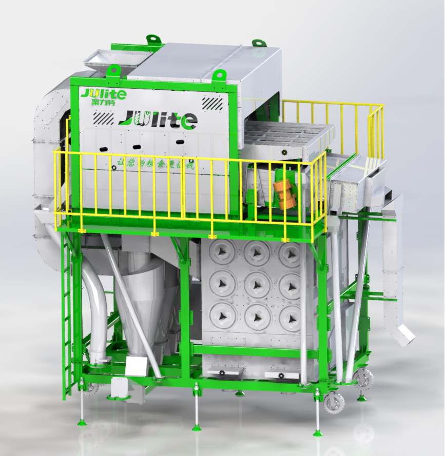5XCSH-50環(huán)保初清篩主要由上下兩部分結(jié)構(gòu)組成,其中上部分功能為臥式比重風選、分級,下部分功能為二級除塵;物料首先經(jīng)喂入斗進入臥式風選比重臺,通過臥式比重風選分離去除物料中的粉塵、糠殼、碎秸稈、玉米軸芯等輕雜,其中含塵氣體經(jīng)旋風除塵器完成一級除塵,去除粉塵、糠殼等輕雜,經(jīng)過一級除塵的細小粉塵空氣進入脈沖除塵器完成二級除塵,去除更細小的粉塵,達到合規(guī)潔凈排放。臥式比重風選分離后的物料進入一層大雜篩去除大雜,然后并行進入四層小雜篩去除小雜,排出成品。